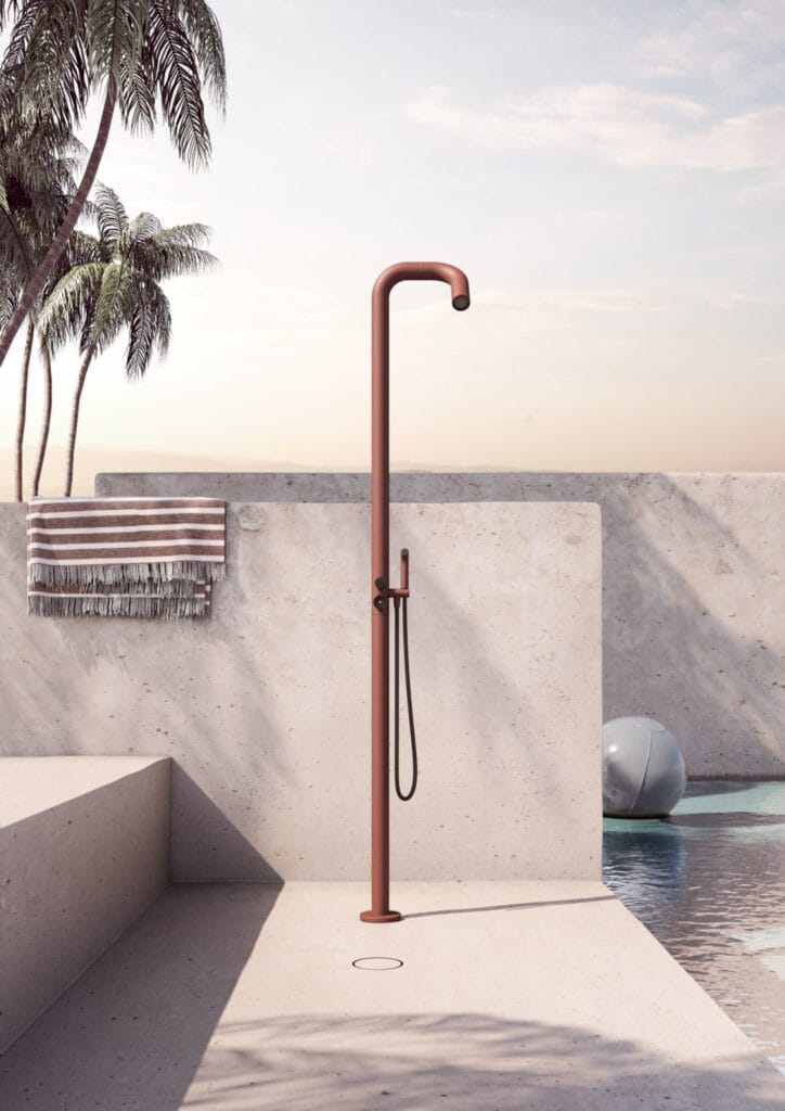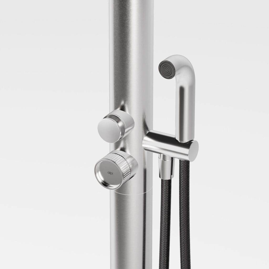 Posebno pozornost si zaslužijo tudi zunanji tuši za uporabo ob bazenih in na terasah. Kolekcija Track je dober primer, kako Alpi združi minimalizem, funkcionalnost in zunanjo uporabo v enem izdelku. Gre za zunanji tuš z zelo čisto jekleno formo, z usmerljivim curkom, ročno prho in jasno zasnovanim upravljanjem. Na voljo je v več obdelavah, med njimi stainless steel, terracotta, ebony in sand, zato lahko deluje tako v sodobnem bazenskem ambientu kot ob bolj toplih naravnih materialih.