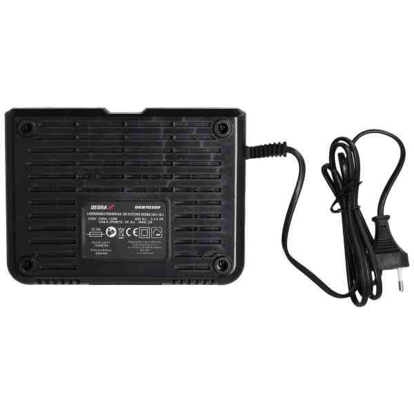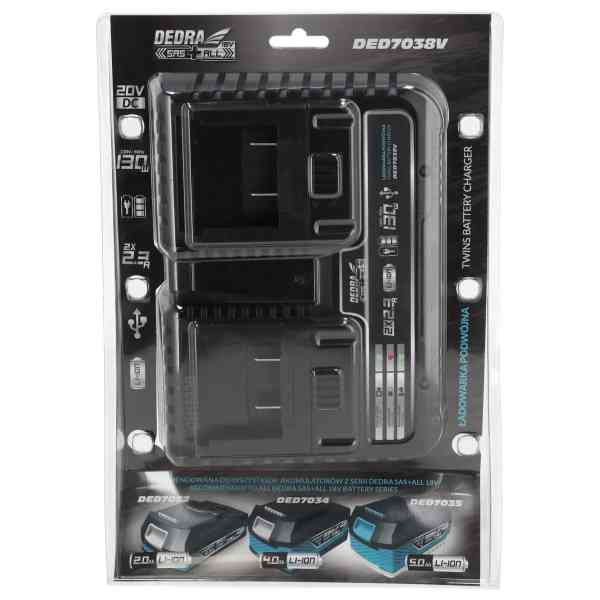 To je namenski izdelek za polnjenje baterij iz linije SAS+ALL (DED7032, DED7034, DED7035, DED6936, DED6937). Baterijo zzmogljivostjo 2,0 Ah lahko napolnite v eni uri, baterijo z zmogljivostjo 4,0 Ah pa v dveh urah. Z dvema polnilnima vtičnicamalahko baterije polnite še učinkoviteje. Polnilec je opremljen s tremi diodami LED: ena označuje, da so baterije priključene na električno omrežje, druga, da poteka polnjenje, in tretja, da je polnjenje končano. Z dvema vtičnicama US B lahko priključite pametni telefon ali zvočnik Bluetooth.